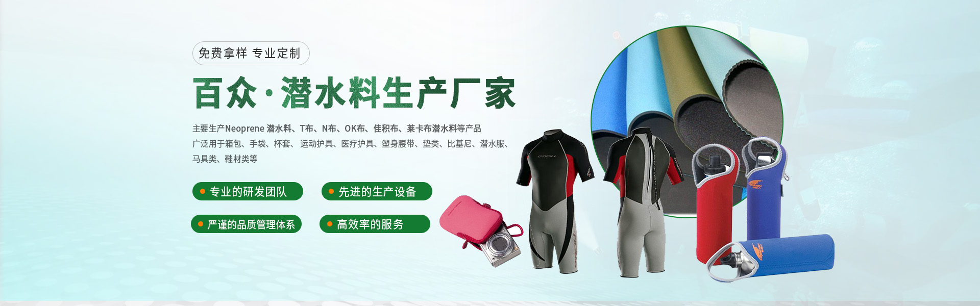 東莞市百眾運動用品有限公司成立于1996年,廠房面積有3500平方米,日產量15000米。免費寄樣,3-5天快速量產! 主要生產Neoprene 潛水料、T布、N布、OK布、佳積布、萊卡布潛水料等產品! 潛水料已通過SGS環保測試,新歐標RAECH161測試。廣泛用于箱包、手袋、杯套、 運動護具、醫療護具、塑身腰帶、墊類、比基尼、潛水服、馬具類、鞋材類等 成品系列有:電腦包,杯套,鼠標墊,午餐包,潛水服,騎行手套,止鼾帶,矯帶, 瘦臉帶,眼罩等產品!支持來圖、來樣、各種尺寸定做。 歡迎各界客人蒞臨參觀和業務洽談!